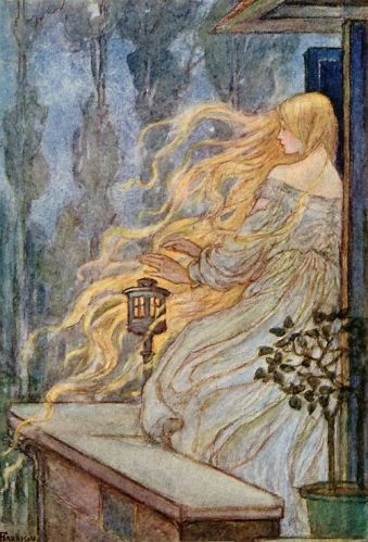 (The image is an illustration for “Rapunzel” by Emma Florence Harrison.)